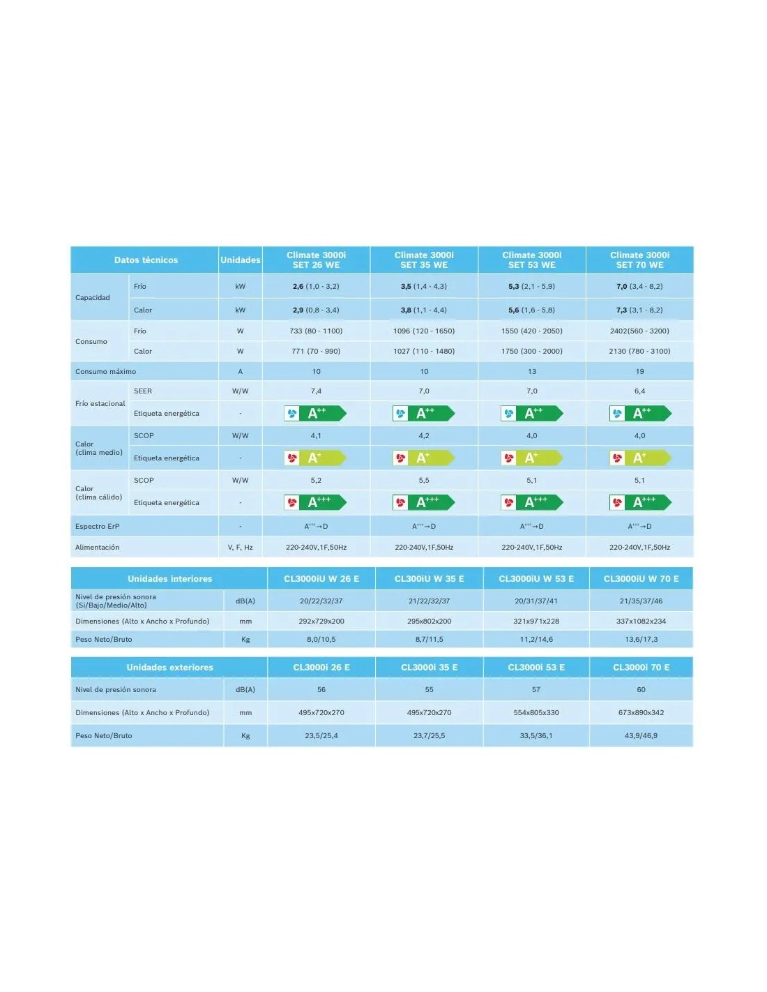 La serie CLIMATE 3000i incluye equipos desde 2,6 a 7,0 Kw,. Todos presentan una calificación energética A+, A++ O A+++, cumpliendo con los requisitos de la nueva normativa de contaminación de refrigerantes con refrigerante más ecológico R-32.