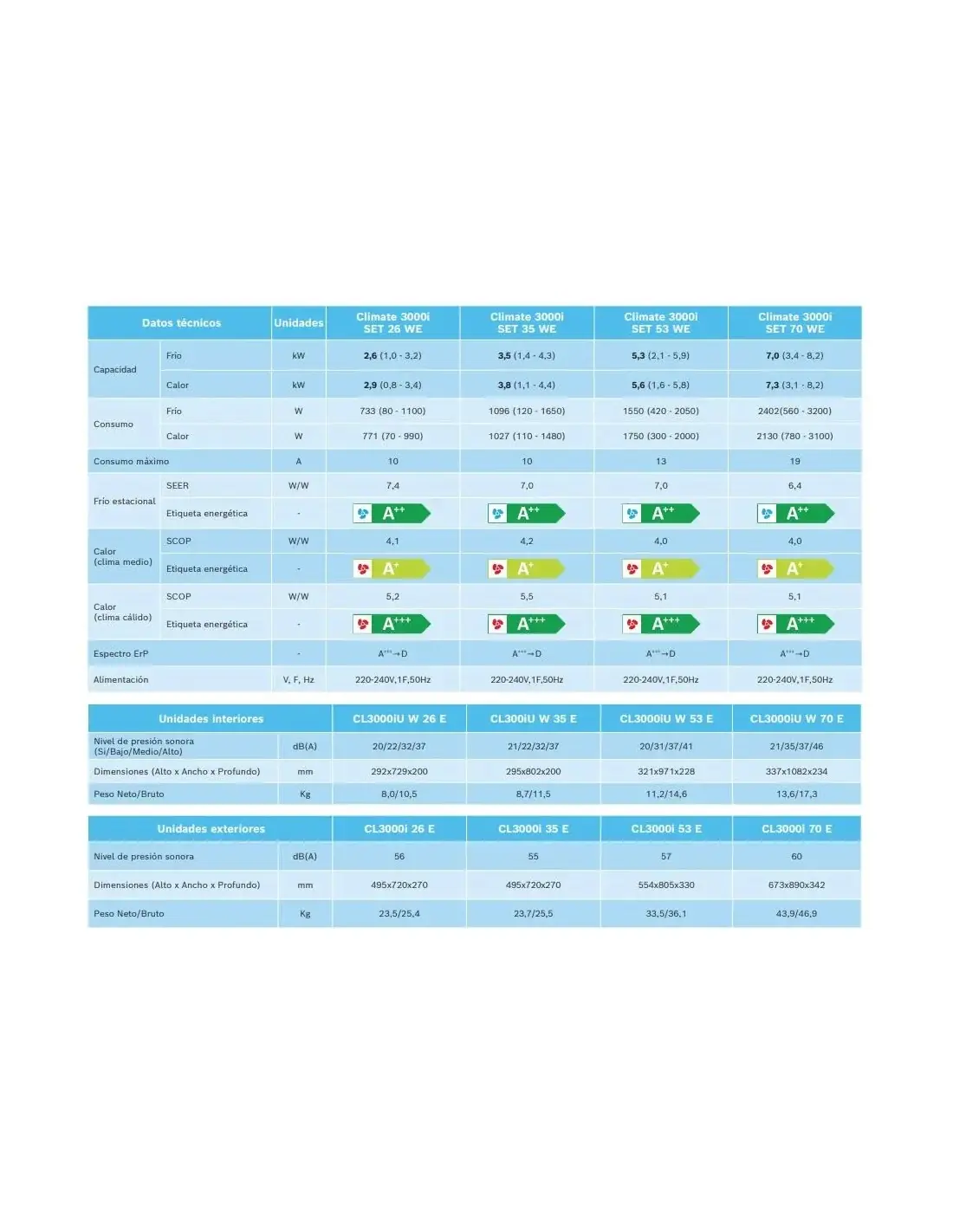 La serie CLIMATE 3000i incluye equipos desde 2,6 a 7,0 Kw,. Todos presentan una calificación energética A+, A++ O A+++, cumpliendo con los requisitos de la nueva normativa de contaminación de refrigerantes con refrigerante más ecológico R-32.